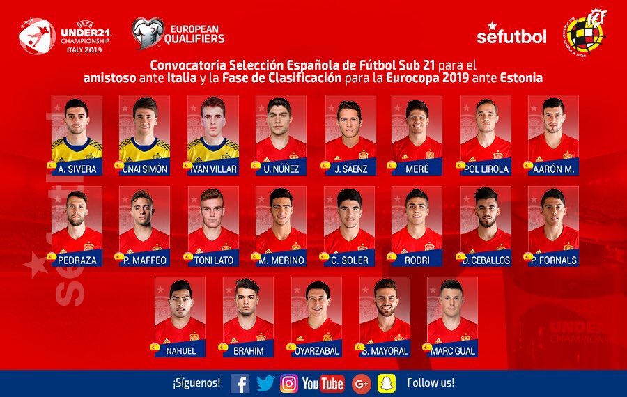 Eurocopa femenina de fútbol sala de la uefa. Sivera, meré, aarón, nuñez, vallejo, carlos soler, fabián, dani ceballos, merino, oyarzabal, mayoral, unai simón, fornals, dani olmo, marc roca, pedraza, soriano, rafa mir, martín, maffeo, rodri. Fabián ruiz e dani olmo fazem os gols do quinto título da fúria da competição de base europeia, igualando. Este domingo 16 de junio arrancan las actividades de la eurocopa sub 21 2019 con uno de los partidos más atractivos del grupo a cuando el anfitrión italia se mida a la selección de españa. El próximo 16 de junio empezará la 22º edición de la eurocopa en categoría sub21, donde podremos ver a realidades del fútbol internacional así como a futuras estrellas.